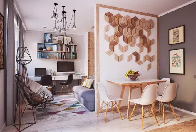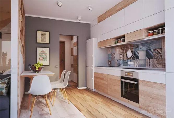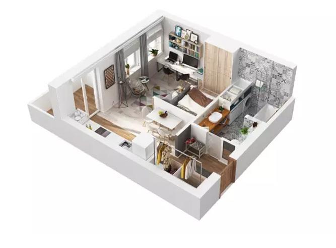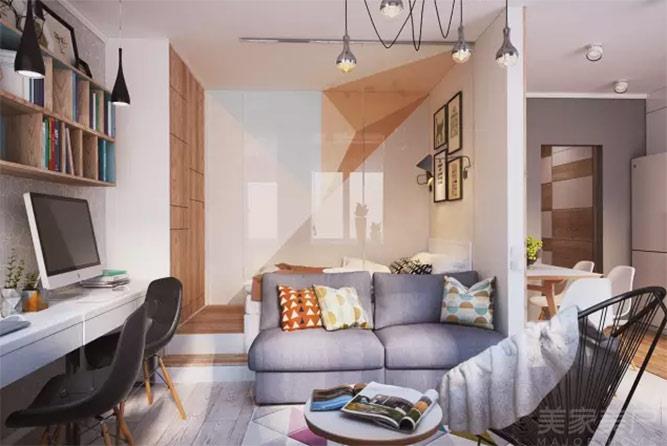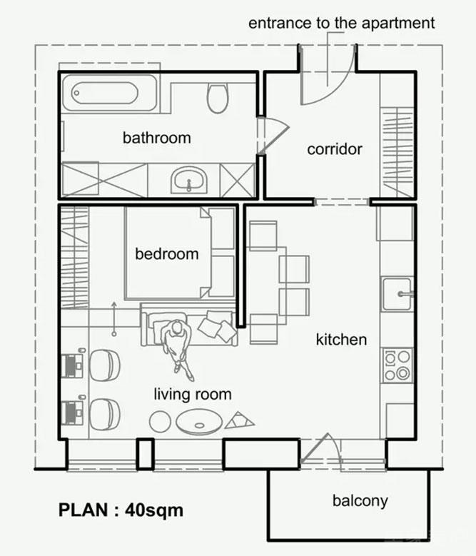 40平米的面積,按部就班的極簡風格,將基礎功能全部妥善安置。用腳下的地板和瓷磚劃分區域,自然舒適。陽臺和窗在公寓的一側,客廳沙發的背后是臥室,用一面玻璃隔開。這樣,除了衛生間以外,每一個房間都有足夠的自然采光。
