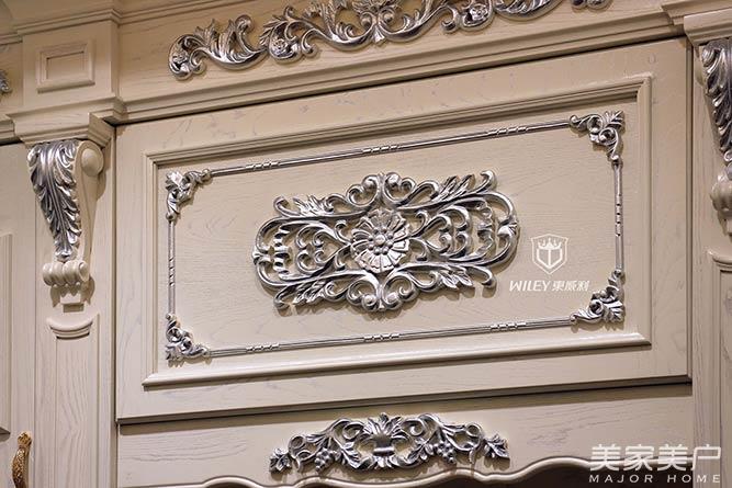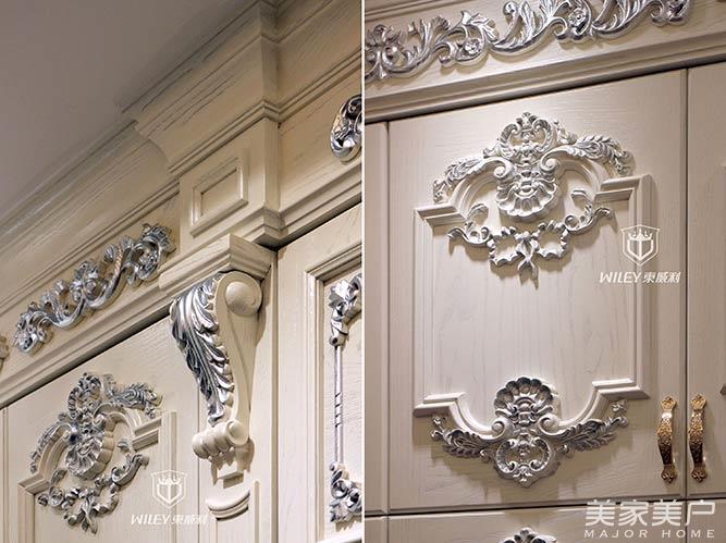珍珠白的衣帽間采用半開(kāi)放加銀光紋的油漆工藝,使得粗獷木紋在光照下有一種閃銀的質(zhì)感。柜門上的法式雕花件做了擦銀效果,更是讓衣柜整體看上去充滿法式的奢華尊貴。
