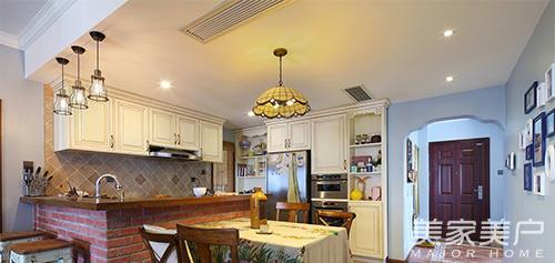 點評:美式風格餐廳在裝飾上也有很多講究,如喜好仿古面的墻磚、櫥具門板喜好用實木門扇或是白色模壓門扇仿木紋色。另外,廚房門也喜歡配置實木門等。