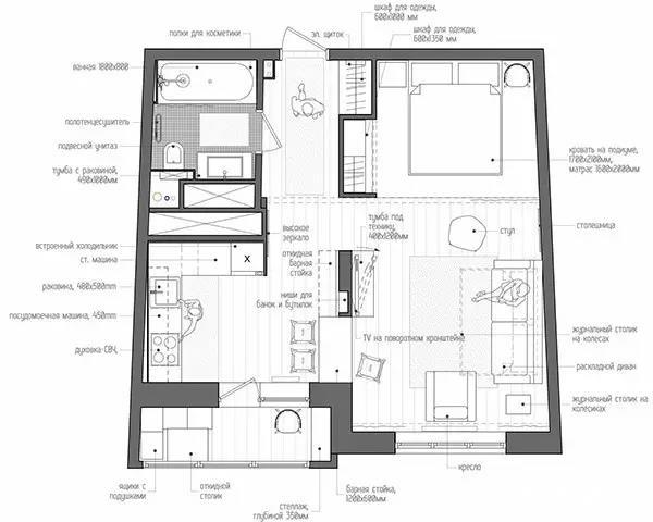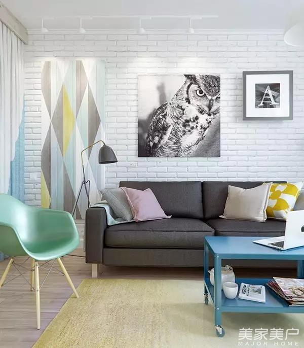 房子的形狀是一個角度不大的梯形,所以為了不讓每一個房間過分的不規則,盡量減少隔斷。除了陽臺與衛生間,其他的房間都選擇開放。鮮活的顏色與白色搭配,適合年輕人的審美。巧妙的儲物設計,輕便的家具,讓活動的范圍更顯寬敞,也多了一些舒適。