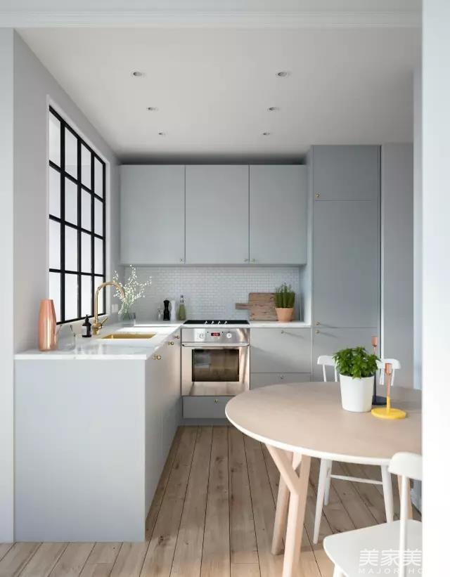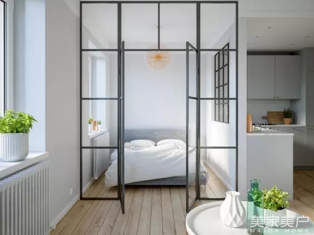 規則的戶型但是面積不大,采用極簡風格的開放式,淺色在視覺上表現更加的寬敞舒適。封閉的臥室使用玻璃隔開,讓光照更加通透。