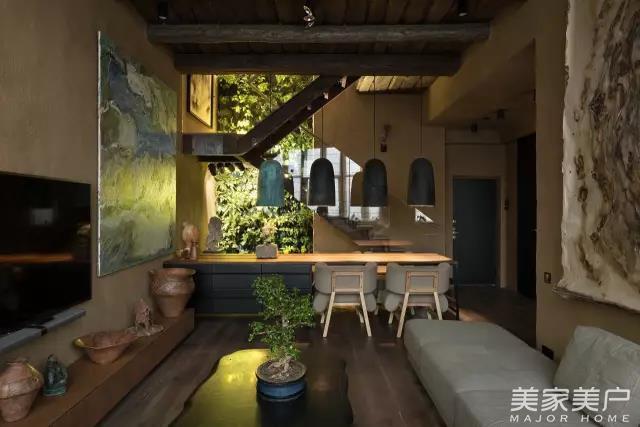 這套雙層公寓的墻壁都使用粘土,這是一種古老的烏克蘭建筑技術,傳統手工地毯體現出烏克蘭的精湛工藝文化。支撐天花板和門道的粗糙木梁營造出清雅的鄉村風格。盆景樹和屋頂花園給公寓增添了東方特色。然而公寓配備了現代設施,使居住更舒適方便。
