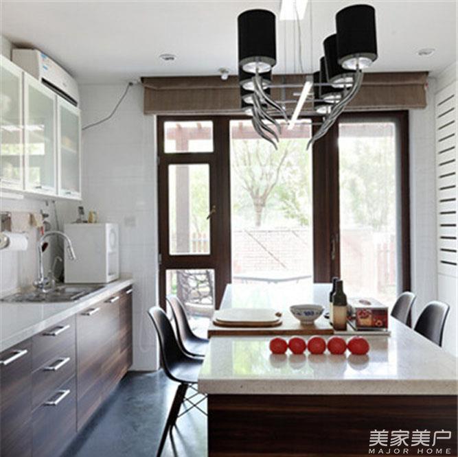 很多小戶型空間除了把餐廳與起居室設(shè)置在一起之外,把餐桌擺放到廚房里面也未免不是另一種方法。搭配上天花板的老式吊燈,暗黃的燈光落在用餐空間里面,樸素、懷舊的氛圍更讓用餐變得浪漫、動人。