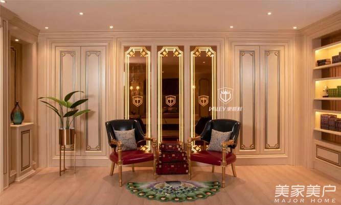 采用溫情色開放漆配搭貝殼,銀箔點(diǎn)綴,讓同一系列產(chǎn)品多樣化,衣柜內(nèi)部釆用愛馬仕橙色帶收納功能的皮革,推拉門配套智能化導(dǎo)軌,多元素的完美組合,讓空間既充滿人性化,也具備了古典與現(xiàn)代地雙重審美。