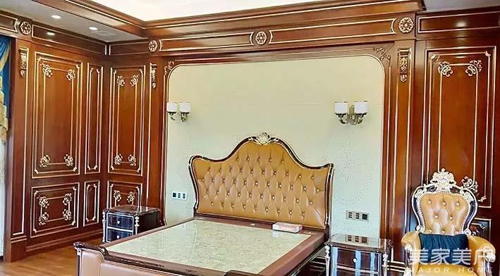 二樓是主人的臥室和書房,墻板以長方形或方形居多,外框做成了精致的框格、用原木色油漆修飾,框內細部用富于雕刻的卷草舒花修飾,雕花不多卻精致,中間襯以金色挑花效果。吊燈、臺燈,以及電視機后背尚未折除的保護薄膜明確房間還在最后的裝飾當中,但滿目的金光閃閃的曲形腿腳,精工細琢的描金壁飾、極富裝飾帷幔布藝,色彩艷麗的金邊宮廷裝飾畫,將所有與法式藝術有關的浪漫與尊貴因子顯露出來。構成了自由、從容、華貴絢麗宮廷氣氛。
