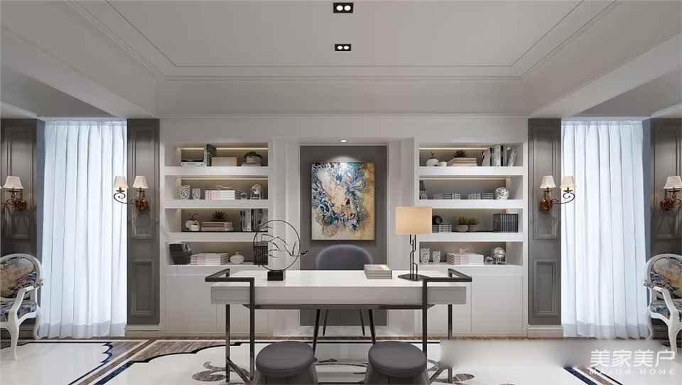 簡單、大方、舒適、清爽的感覺,總體的顏色色調比較清爽,實用性比較強。入墻式書柜設計,不僅可以完成大規(guī)模的藏書功能,濃濃的書卷氣,顯得富有格調。木質的座椅搭配,使整個空間充滿了法式氛圍。