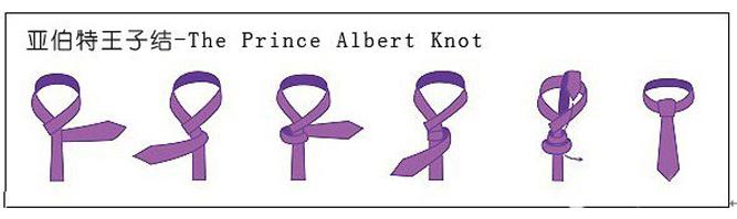 6.亞伯特王子結:適用于質地柔軟的細領帶以及搭配扣領及尖領襯衫,由于要繞三圈,因此領帶切莫選擇較厚的質地。正確打法是在寬邊先預留較長的空間并在繞第二圈時盡量貼合在一起即可完成此一完美結型。