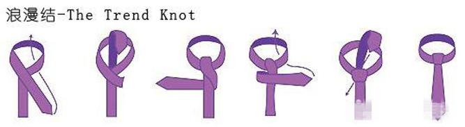 8.浪漫結:適合用于浪漫系列的領口及襯衫。給人坦白、率直,信心十足,具有強烈的自我主張之感。完成后將領結下方之寬邊壓以縐折可縮小其結型,可將窄邊往左右移動使其小部分露在寬邊旁。
