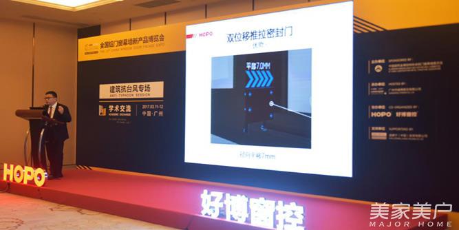 HOPO好博窗控營銷中心總經(jīng)理米建軍先生,從門窗安全角度,以“抗臺風(fēng)、保安全——臺風(fēng)環(huán)境下門窗創(chuàng)新應(yīng)對解決方案”為主題,為現(xiàn)場觀眾闡述了多種創(chuàng)新性解決方案,抗臺風(fēng)能力強、安全性能高、密封性能好的抗臺風(fēng)門窗——雙位移推拉密封門窗,比歐標(biāo)C槽承重性、安全性更高的K(寬)槽系列產(chǎn)品,以及陽臺折疊窗、廚房自動門等創(chuàng)新型產(chǎn)品解決方案。