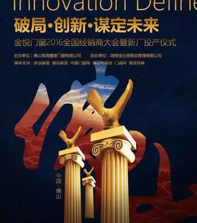 2016年7月5日 - 6日,金悅門窗舉辦了2016年全國經銷商峰會。本次峰會以“破局. 創新. 謀定未來”為核心主題,傳達了金悅門窗對內部改革的決心,以及對終端營銷主動出擊,贏戰市場的必勝信念!