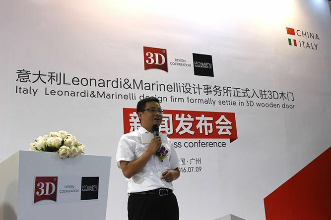 7月9日,《意大利Leonardi&Marinelli設計事務所正式入駐3D木門》新聞發布會在第18屆中國廣州國際建博會期間隆重舉行。中國木材與木制品流通協會木門窗專業委員會會長張國林、全國工商聯家具裝飾業商會執行秘書長張仁江等行業領導、3D木門高層、3D木門設計師Leonardi、藝術總監Marinelli,以及現場數十家行業媒體共同見證了這一偉大時刻。
