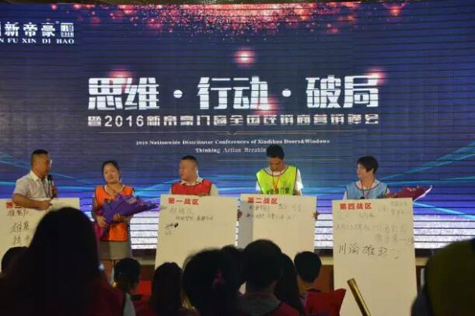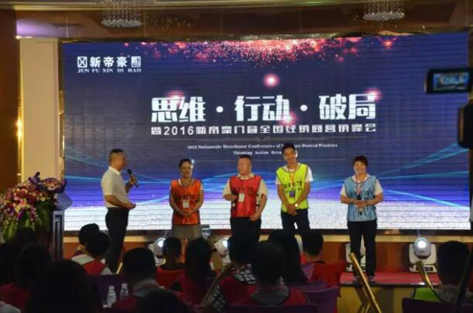 2016年7月7日,以“思維?行動?破局”為主題的“新帝豪門窗2016新品發布暨營銷峰會”在佛山大瀝盛大召開。出席本次峰會的有“新帝豪門窗”董事長鐘金福、營銷總監汪總等高層領導以及全國各地經銷商等。