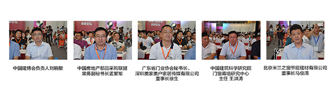 中國建博會負責人劉曉敏,中國建筑金屬結構協會秘書長助理兼聯絡部主任、中國建筑門窗系統聯盟執行理事長、全聯房地產商會副監事長兼寫字樓分會理事長、中國產業鏈創新合作分會監事長、中國房地產部品采購聯盟常務副秘書長孟繁軍,廣東省門業協會秘書長、深圳美家美戶家居傳媒有限公司董事長徐生,全國建筑幕墻門窗標準化技術委員會秘書長、中國建筑科學研究院門窗幕墻研究中心主任、中國建筑門窗系統、聯盟副理事長兼總工全國建筑幕墻門窗標準化技術委員會秘書長王洪濤,中國建筑金屬結構協會副會長、中國建筑門窗系統聯盟輪值理事長、全聯房地產商會會長助理、北京中關村中歐節能門窗產業技術創新戰略聯盟理事長、北京米蘭之窗節能建材有限公司董事長馬俊清。