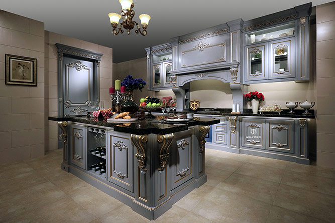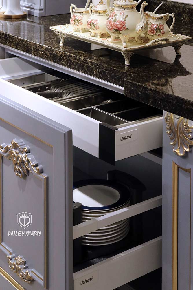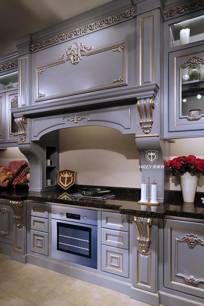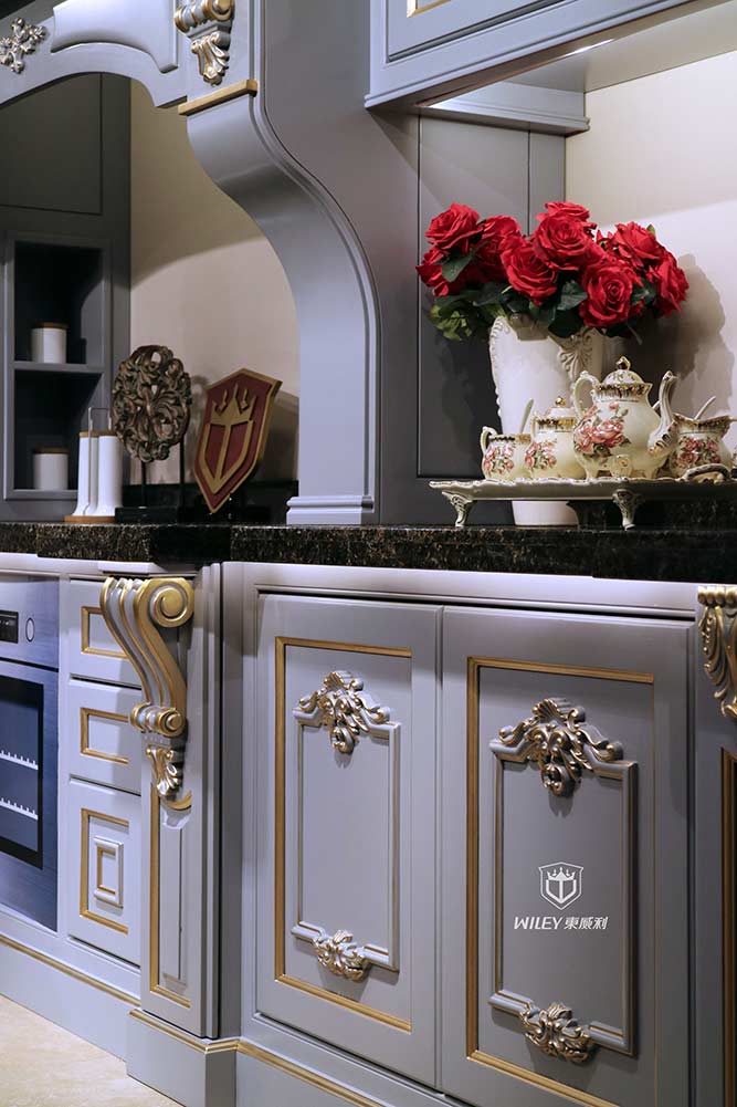 法式巴洛克櫥柜以明亮婉柔的色彩,融于家具當中的韻律美,注重體現起伏的層次感,玲瓏起伏,“S”形的渦卷紋柱托等元素為設計的主要理念。在純手工雕琢的貝殼紋雕花,橡樹果花葉等要素的修飾下,賦予了櫥柜一種親切和典雅的格調;柔光燈的影射下,整體融于一個浪漫愜意的氣氛,法式情懷得到淋漓盡致的展現;東威利精致法式實木櫥柜極具貴族氣質與人文氣息,就像法國人一貫的生活品位,廚房更成了家人締造情感空間的最佳場所。