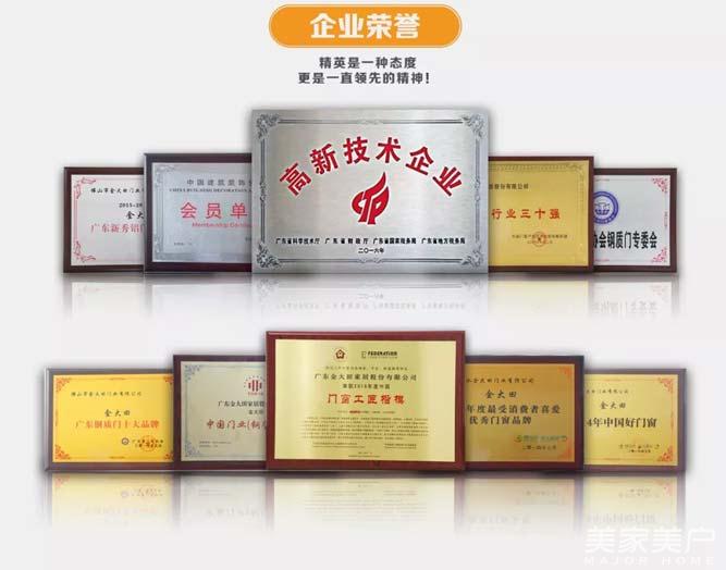 經(jīng)過多年的沉淀與發(fā)展,金大田相繼獲得“國家高新技術(shù)企業(yè)”稱號、“2013年中國最受消費者喜愛門窗品牌”、“廣東優(yōu)秀鋁門十大品牌”、“廣東鋼質(zhì)門10大品牌”、“中國門業(yè)(鋼質(zhì)門)金獎”、“中國整體家居聯(lián)盟成員單位”、“廣東省鋼質(zhì)門會長單位”等諸多榮譽(yù),深得市場及消費者的認(rèn)可,是地產(chǎn)商、家裝公司的優(yōu)質(zhì)戰(zhàn)略合作伙伴。