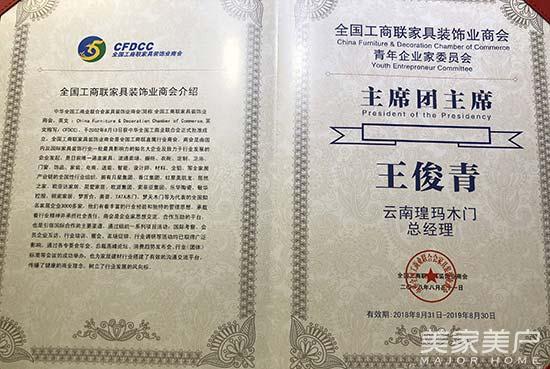 瑝瑪木門王俊青榮獲全國工商聯(lián)家居裝飾業(yè)商會青年企業(yè)家委員會主席團(tuán)主席