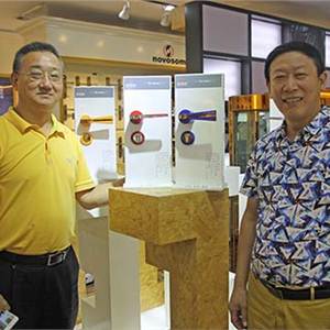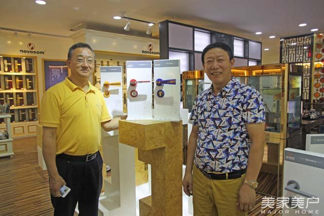 廣東省門業(yè)協(xié)會秘書長徐生(左)與諾維索瑪總經(jīng)理肖建明在展廳合影