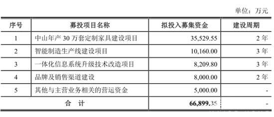 招股書顯示,頂固集創本次公開發行不超過2850萬股股票,擬募集資金6.69億元,用于中山年產30萬套定制家具建設項目、智能制造生產線建設項目、一體化信息系統升級技術改造項目、品牌及銷售渠道建設以及其他與主營業務相關的營運資金。