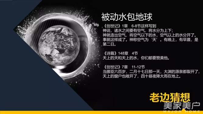 《圣經》中《詩篇》148章4節這樣說:“天上的天和天上的水,你們都要贊美他。”解讀起來,我就在心里畫了這樣一幅圖畫:我們所居住的地球,上面包裹著一層厚厚的空氣層,空氣層上面還有一層厚厚的水層。太陽光、隕石及各種射線,必須要經過這個厚厚的水層過濾后,才能到達地球表面。這個架構,我把它稱做“被動式水包地球”。我謂之:“老邊猜想”。我想象那時候的氣候環境就是上帝說的“甚好”:果蔬里沒有荊棘,人類以天為被以地為席,和老虎是朋友,四周鳥鳴山幽,舒適愜意,健康無比。顯然,人類在那樣溫濕度,潔凈度都超級適宜的環境下生活,是不需要房子的,當然也就無需門窗。在這樣的環境下生活,活到900歲也就不難想象了。