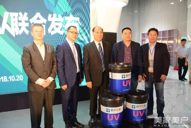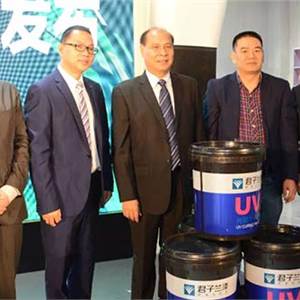 活動現場,廣東涂料協會秘書長呂水列先生、君子蘭集團董事長馬慧峰先生、潤成創展董事長關潤開先生、卡爾·凱旋董事長王向東先生、可森木業董事長李建元先生共同為君子蘭LED-UV揭開神秘面紗!君子蘭LED-UV正式亮相!