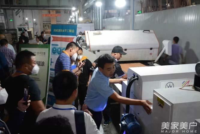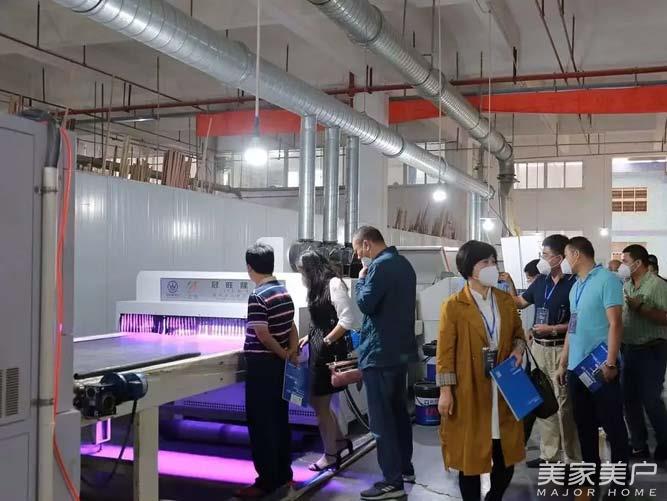 活動現場,嘉賓來到潤成創展UV高光靜電吊線噴涂房感受君子蘭UV高光靜電噴涂效果。UV靜電噴涂較之傳統噴漆節省了三分之二的油漆用量,綜合產能比傳統噴涂翻三番(每天完成800套木門面漆噴涂);