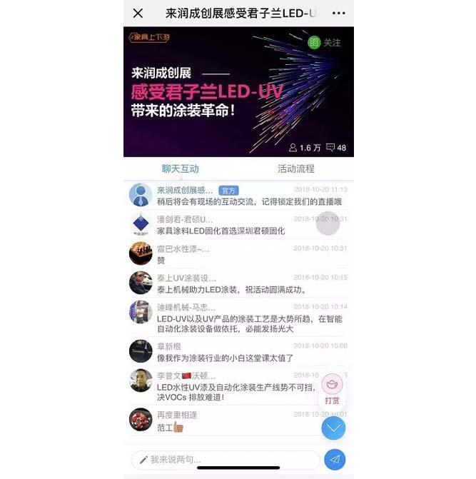 此次活動收獲了家具產業鏈的熱烈反響,共有1.6萬行業人士通過家具上下游視頻直播收看了本次活動,在線上“感受”LED-UV“帶來的涂裝革命!