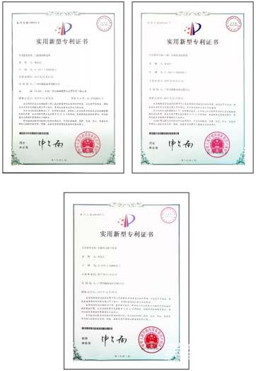 (上圖分別是“自動壓料推臺鋸”、“護墻板框架及鋁木護墻板”、“玻璃萬向旋轉(zhuǎn)工作臺”、“門窗鋁型材”、“門窗玻璃轉(zhuǎn)運車”、“門框、窗框轉(zhuǎn)動掛物架”、“水循環(huán)式除塵裝置”專利證書)
