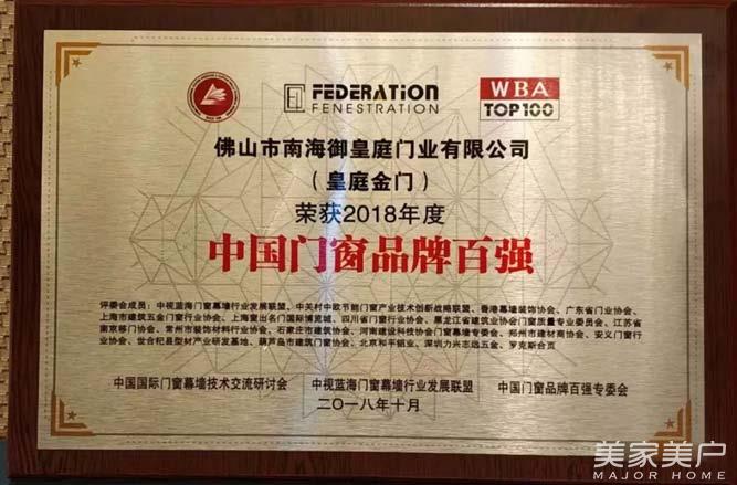 經過12年的發展壯大,皇庭金門的實力有目共睹,2018年10月30日,中國國際門窗幕墻技術交流研討會,中央藍海門窗幕墻發展聯盟,中國門窗品牌百強委員會給皇庭金門頒發《中國門窗百強》企業稱號!
