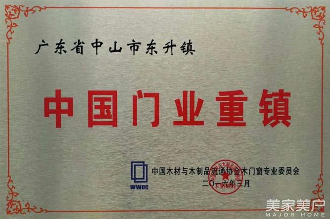 2016年3月22日,在北京會議中心召開的中國木門十五周年慶典大會上,廣東省中山市東升鎮鎮長上臺接受中國木材與木制品流通協會木門窗專業委員會頒發的牌匾,東升木門產業基地被授予《中國門業重鎮》榮譽稱號。至此,廣東-東升已成為中國門業四大產區之一《中國門業重鎮》。