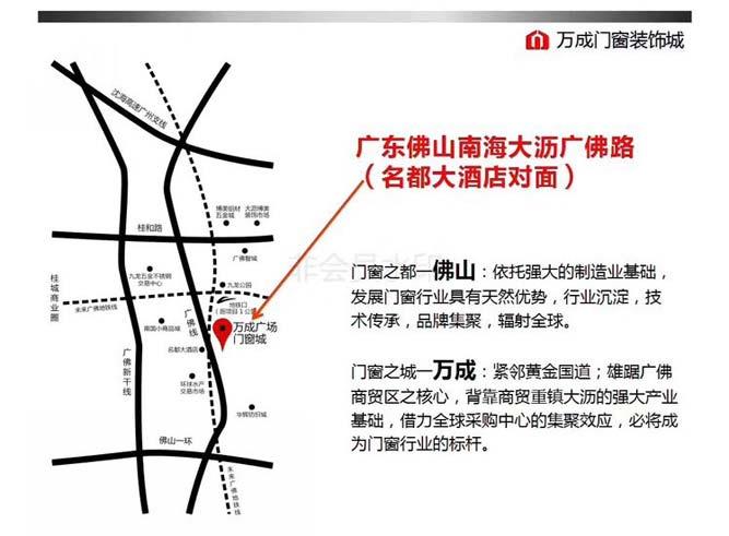 佛山萬成門窗廣場地理位置優越,交通便捷,建筑項目16萬平方米,致力打造成為佛山高檔門窗幕墻產品的展示、交易平臺。