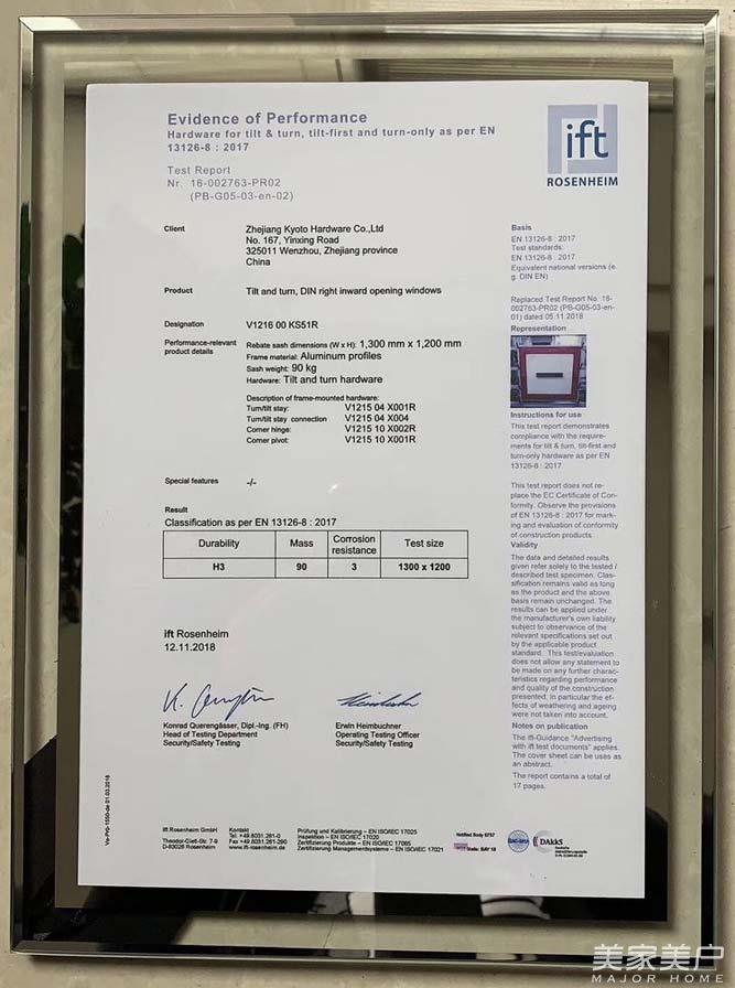 京都五金“整窗五金”系統(內平開內倒)首家通過德國羅森海姆門窗幕墻研究院監測標準,邁出了中國門窗五金與國際同步的重要一步。
