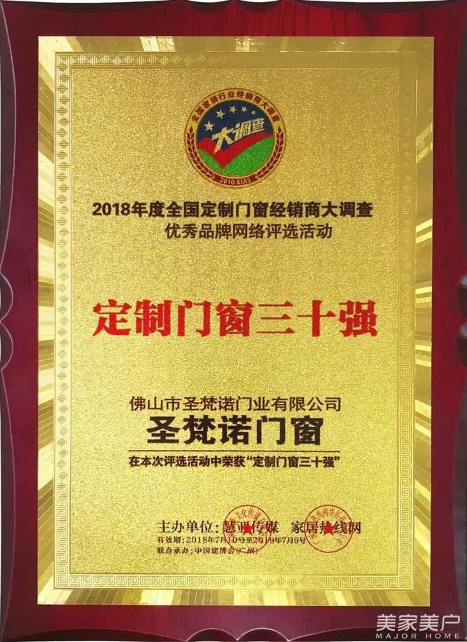 2018全國定制家居&門窗行業經銷商大調查,圣梵諾門窗榮獲《定制門窗三十強》。