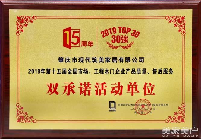 “全國市場、工程木門企業產品質量、售后服務雙承諾活動”已連續成功舉辦十四屆,形成了行業極具標志性的品牌活動,通過樹立企業的品牌形象,引領行業規范化發展,為行業品牌建設做出了重要貢獻,2019年正值活動開展的第十五年。發布會環節,第十五屆木門雙承諾活動企業榜單隆重揭曉,現代筑美家居連續兩年榮獲“2018木門雙承諾活動單位30強”稱號,這也代表了現代筑美對消費者的承諾。現代筑美家居常務副總經理鞠昶更被授予“中國木門行業年度人物”稱號。