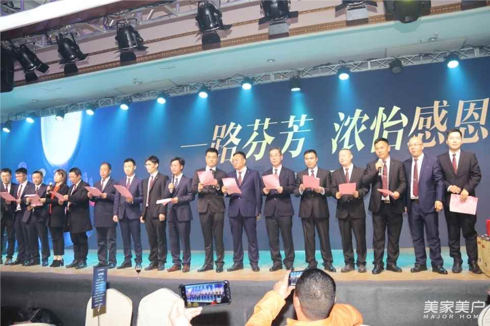 在頒獎答謝晚宴開始前,陳利新董事長率領集團管理團隊宣誓:今天,我們在此鄭重承諾:始終牢記“以德為先,以人為本”的經營理念。2019年全體成員從管理思維向服務思維轉變,客戶至上,市場為先,真誠服務……