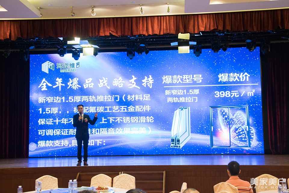 接下來是重頭戲。瑪邇維門窗運營總監劉世雄介紹了瑪邇維門窗的優惠政策以及相關優惠產品:新歐尚兩軌推拉門(1.2厚,標配氟碳工藝五金配件保證十年不褪色,上下不銹鋼滑輪可調保證耐用性和隔音效果完美);108系統窗:斷橋窗紗一體平開窗(厚度1.4,進口德國好博配件,內外平齊幕墻設計)。劉世雄代表公司承諾:在合同期內,如果經銷商賺不到錢,那么合同期滿后瑪邇維門窗將會無條件直接抵扣貸款形式退還。