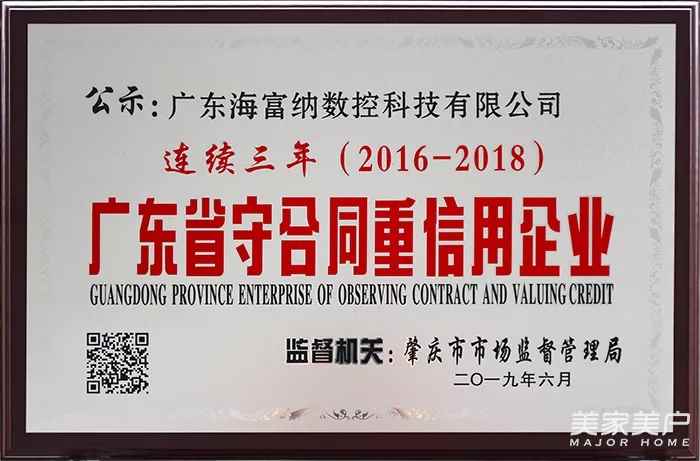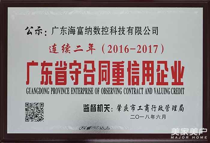 “廣東省守合同重信用企業”評選,是省政府對企業信用的綜合評價活動,旨在推進企業誠信守法經營。自2016年首次獲得“廣東省守合同重信用企業”榮譽稱號,海富納憑借良好市場信譽與優質產品服務,已連續三年順利通過廣東省工商行政管理局的評審。獲此殊榮企業,均意味著社會各界對企業在誠信經營、企業信用體系建設以及維護合同信用等方面的充分肯定與認可,也是工商和市場監管部門對企業高度認可的標志。