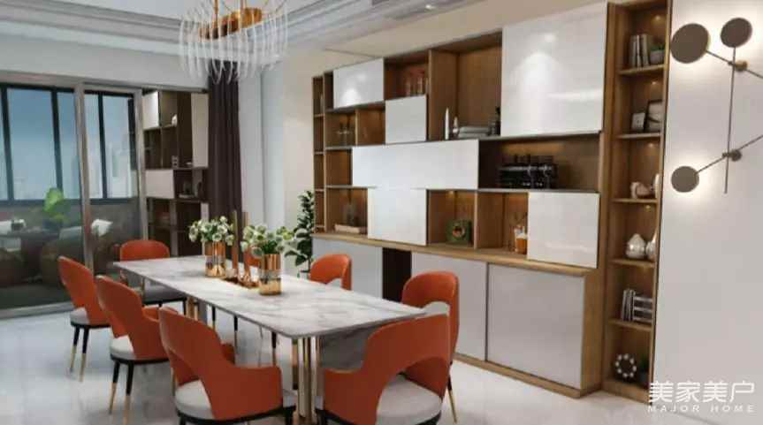 餐邊柜上的移動(dòng)門(mén),可以順滑推拉,形成收納格提升了餐廳空間的儲(chǔ)物功能,并且讓擺放自由隨心,不管怎樣推拉柜門(mén),都能呈現(xiàn)一種和諧,自成一美!