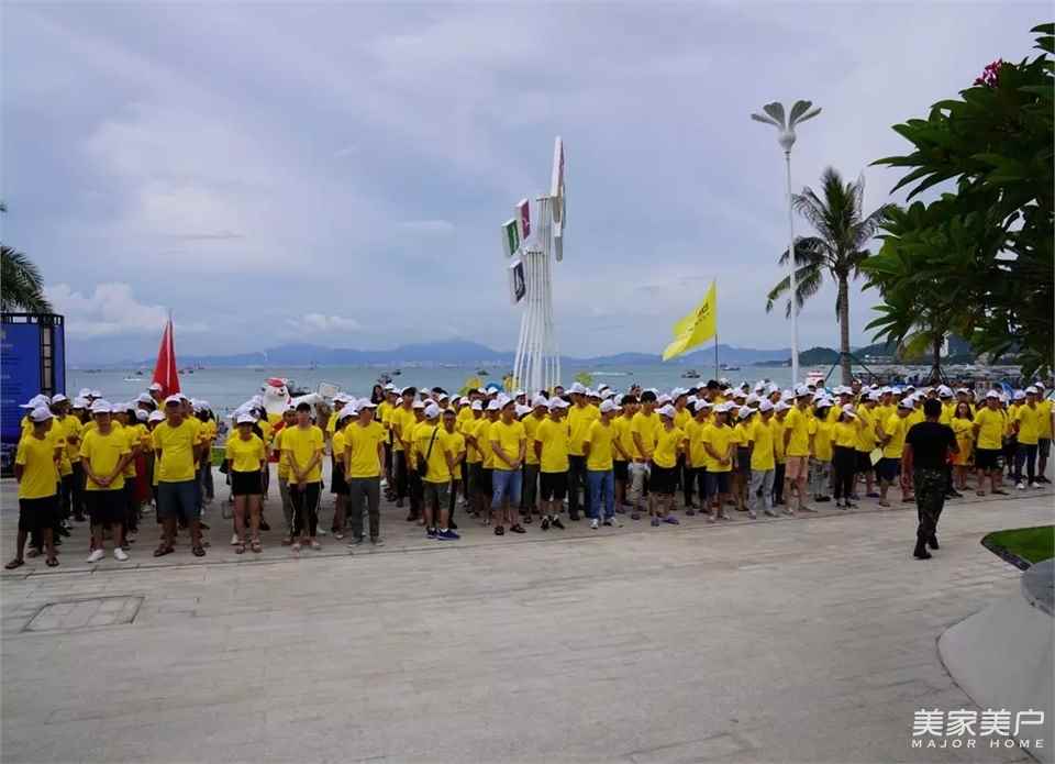 午飯過后小息一會,陽光照耀下寶高全體員工走在海道金光閃耀的寶高文化衫構成黃色海洋與湛藍的海洋相互輝映,在團建教官的指揮下來寶高家人們高效迅速構建方陣,金黃閃閃的寶高旗幟和團隊旗幟在海旁上迎風飛舞。