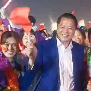 丁佐宏參加晚上國慶聯歡活動時,與游行群眾一起共賀祖國生日