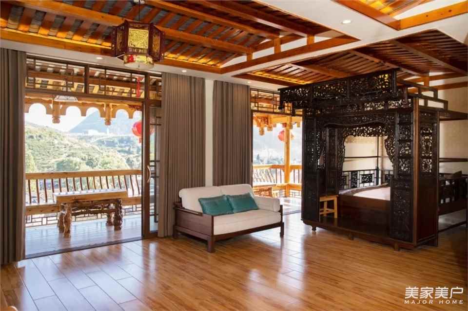 整棟民宿共設一個接待大廳和43間客房,客房與陽臺之間隔斷采用的新豪軒推拉門,價值大約45萬元。