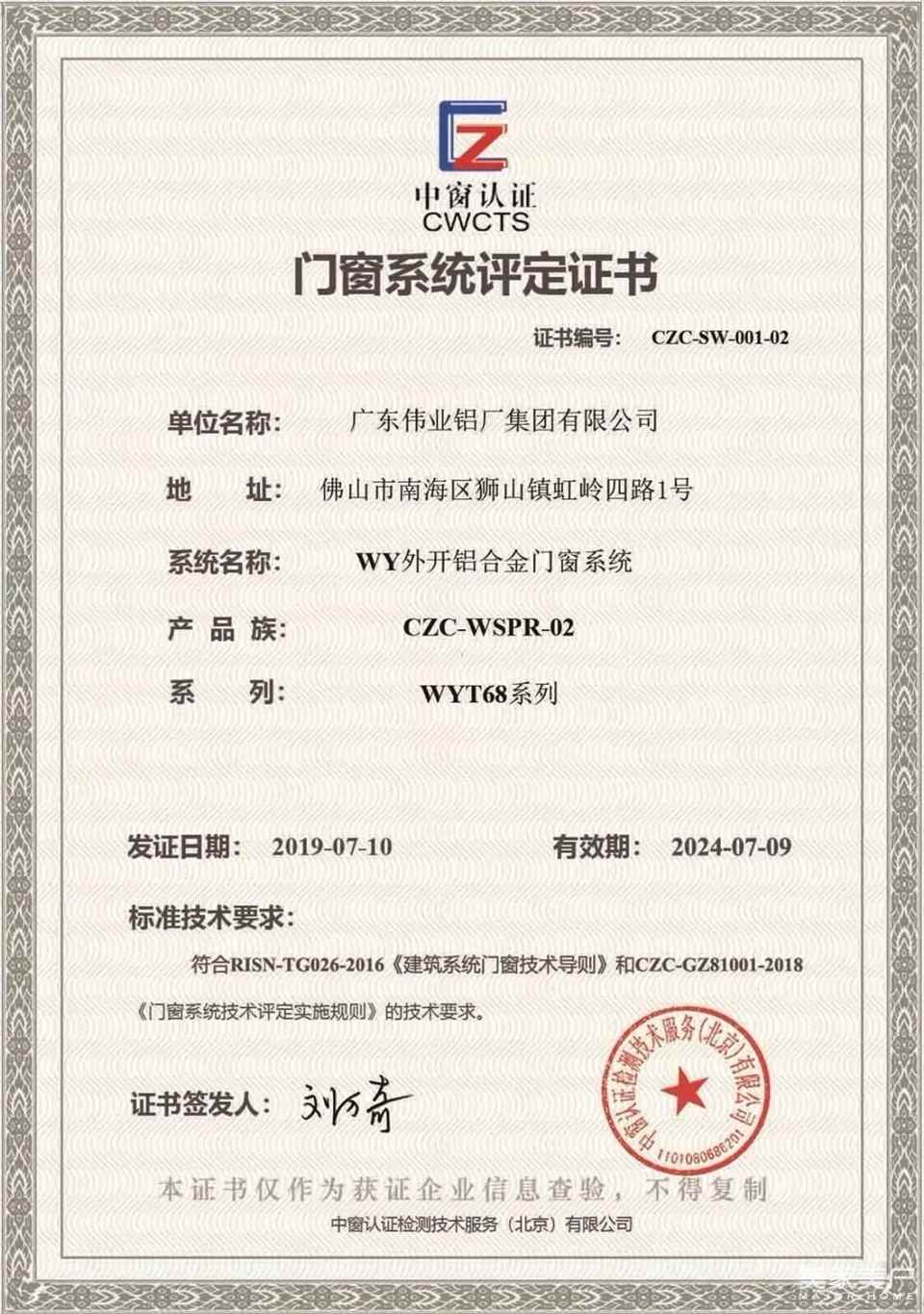 通過認證的產品分別為:WYT68系列WY外開鋁合金門窗系統和 WYT78系列WY內開鋁合金門窗系統。