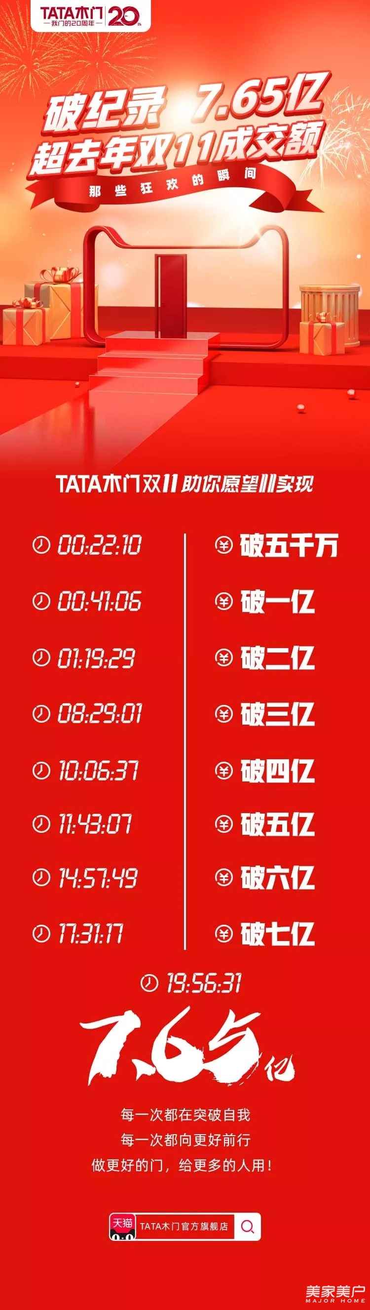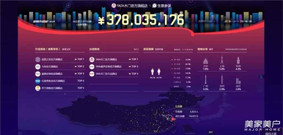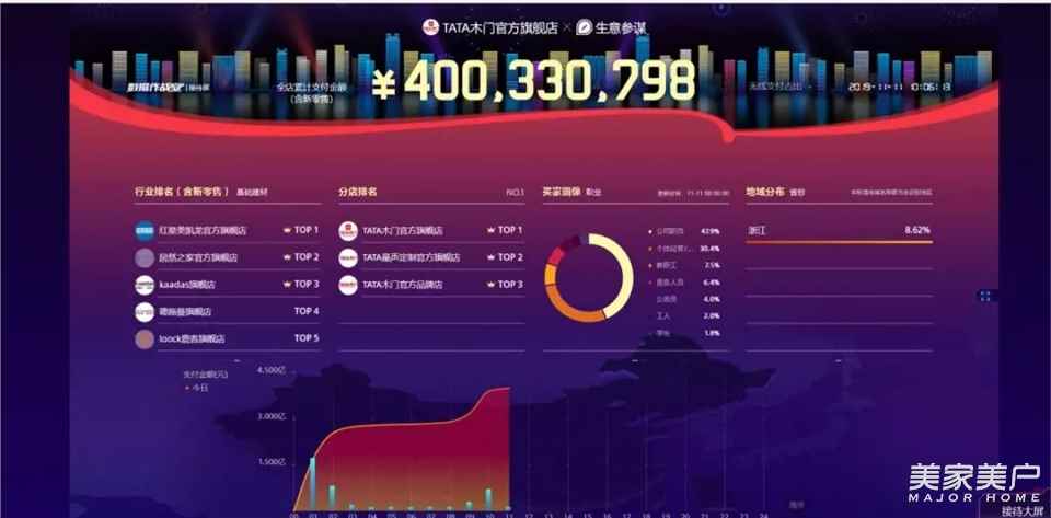 只是誰也沒料到,TATA木門的破億速度竟來得如此快。凌晨【41分06秒】,TATA木門【破1億】銷售額;【1小時(shí)19分29秒】,【破2億】;【19時(shí)56分】,超過2018年全天【7.65億】的銷量,并最終以【8.42億】元的銷售額打破歷史紀(jì)錄,TATA木門攜手居然之家,索菲亞包攬全屋定制冠亞季軍,并且成為TATA木門128個(gè)“億元”品牌之一。