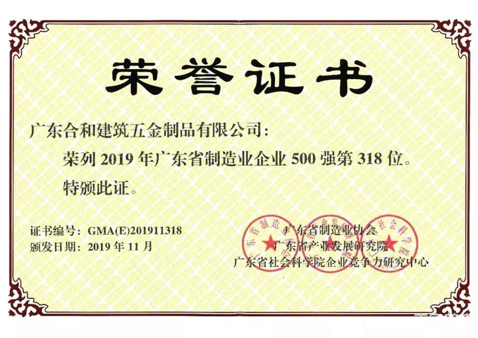 廣東合和建筑五金制品有限公司與華為、富士康、美的等知名企業(yè)躋身成為廣東省制造業(yè)500強(qiáng)企業(yè)!