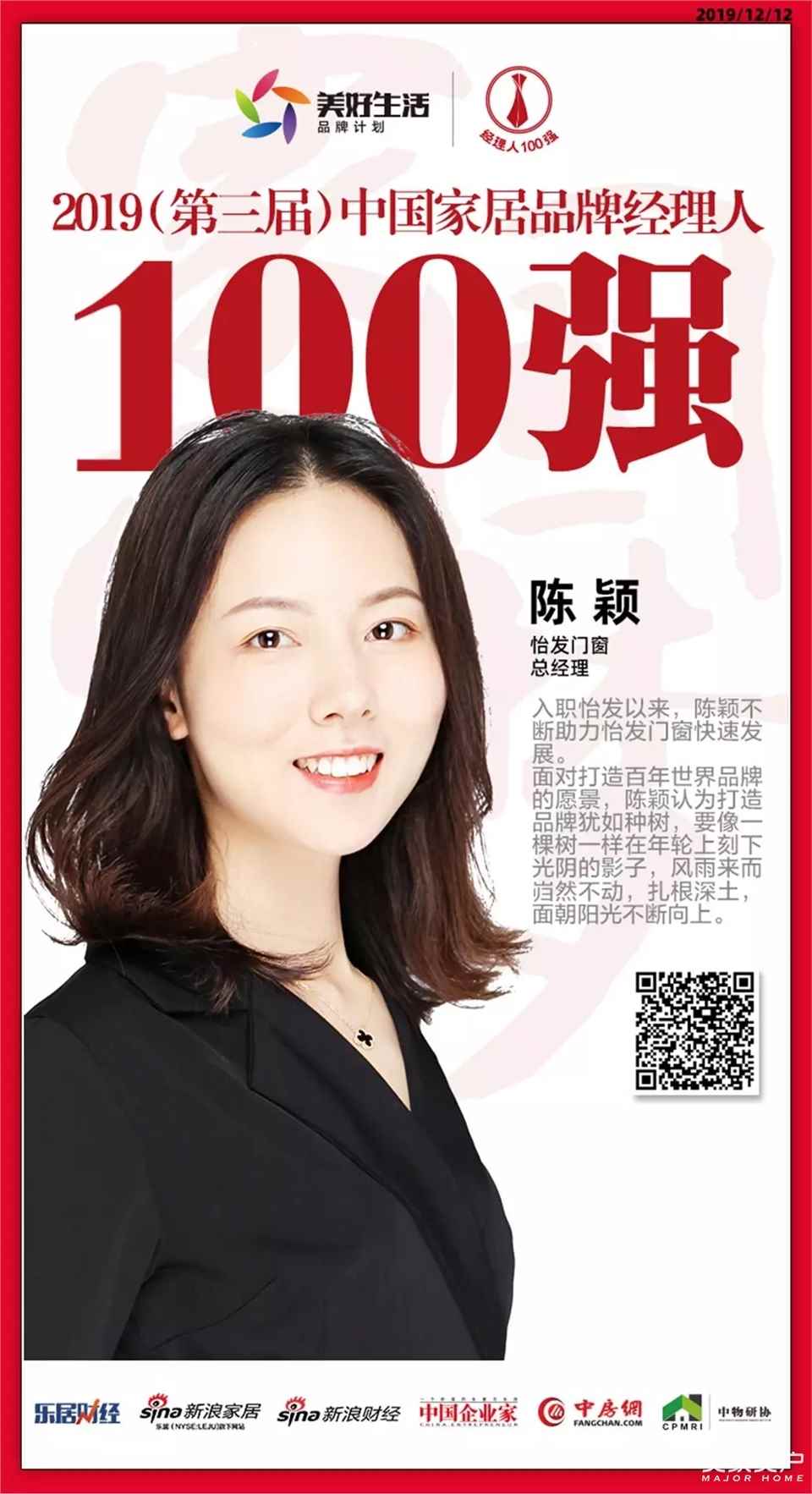怡發門窗總經理陳穎女士榮獲“2019中國家居品牌經理人100強”!
