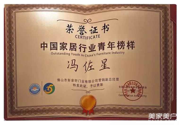 在企業自身發展壯大的同時,馮文波董事長亦致力于中國門窗產業鏈的良性發展,不斷探索歐洲門窗的先進工藝和選材標準,引導行業工藝標準擬定,帶動提升中國門窗的整體水平,他的精神就是“中國門窗脊梁人物”精神的真實表達,當選全國工商聯家具裝飾業商會門窗專業委員會副會長也實至名歸!新豪軒門窗營銷副總經理馮佐星先生被評為:中國家居行業青年榜樣!中國門窗先鋒人物!