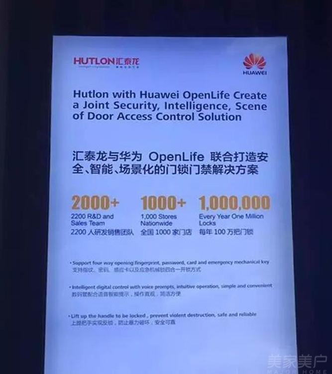 會上,匯泰龍智能事業部總經理黎宇表示,智能門鎖作為智慧家庭的第一道安防屏障,對智慧家庭生態來說至關重要。作為行業知名的智能生活五金品牌,匯泰龍擁有二十年的產品研發設計與制造能力,在全國范圍內建立1000多家專賣店,幾千個營銷網點,擁有完善的銷售網絡;華為擁有強大的云服務,并在管道建設與運營、系統集成方面頗有建樹。此次合作,通過結合雙方各自的強項,聯合打造門鎖門禁解決方案,共建智慧家庭生態,將為用戶帶來更便捷的服務和更舒適的體驗。