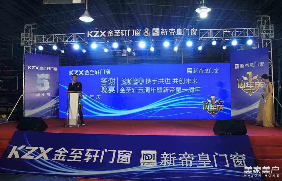 2020年1月7日, 2020金至軒門窗五周年暨新帝皇門窗一周年答謝晚宴在廠部隆重舉行。佛山市金至軒、新帝皇門窗有限公司董事長梁麗華、總經理趙劍飛攜友好嘉賓、合作伙伴、供應商,以及企業全體員工齊聚一堂,共同見證金至軒門窗五周年暨新帝皇門窗一周年慶典。