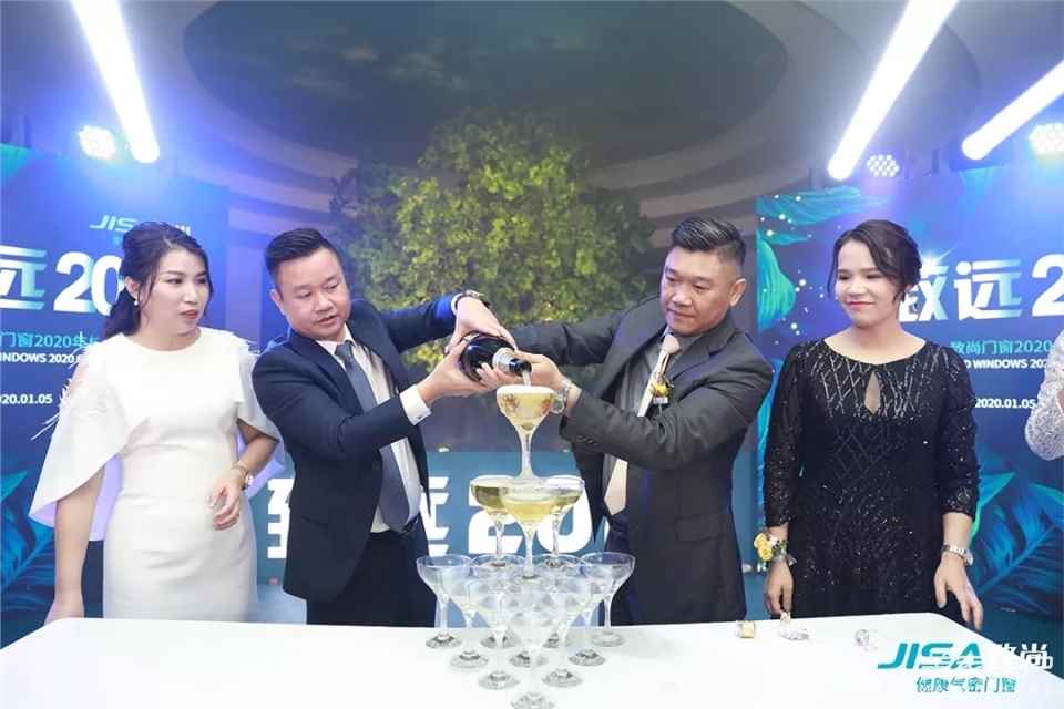 致尚門窗兩位董事長(zhǎng)及董事長(zhǎng)夫人為酒會(huì)啟開(kāi)香檳祝酒