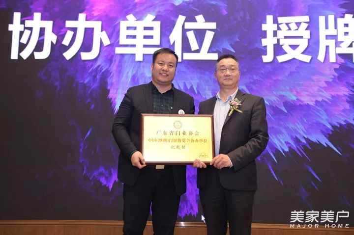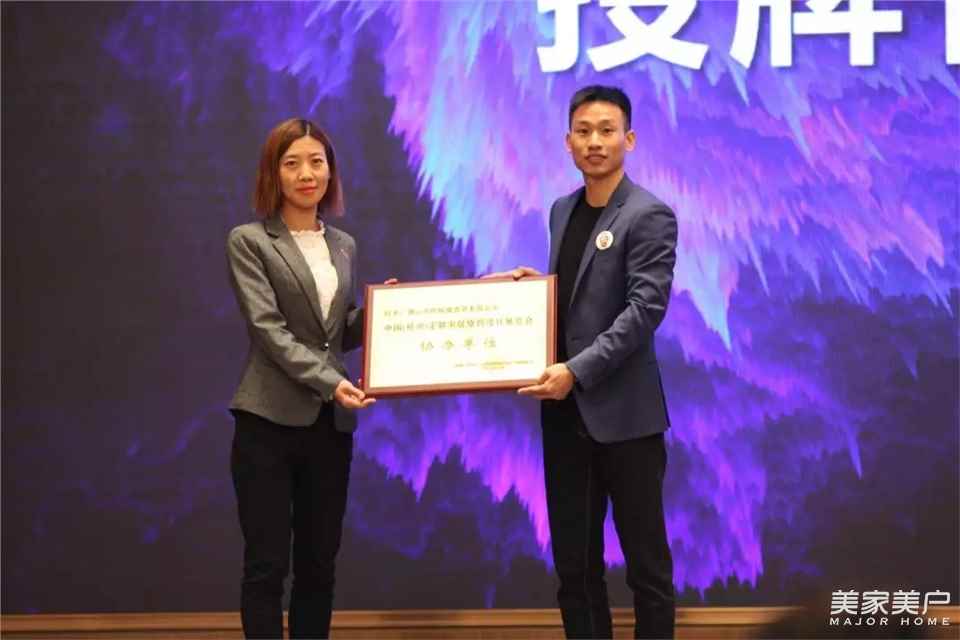 論壇環節結束,晚會在經過短暫的休息后,廣東省門業協會秘書長徐生上臺作了2020年3月中國(潭州)門窗博覽會的介紹,并作為頒獎嘉賓,為協辦單位機械貓總經理黃唯頒發了中國(潭州)門窗博覽會協辦單位的獎牌。