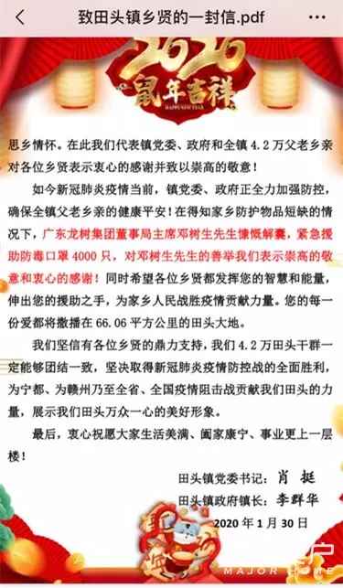 近日,廣東龍樹集團董事局主席鄧樹生在得知家鄉防護物品短缺的情況后,慷慨解囊,向田頭鎮緊急捐贈防毒口罩4000只。同時,鄧樹生還向贛州紅十字會和寧都縣捐贈醫用口罩共計8000個。作為一家有社會責任感的企業,龍樹集團一直心系疫區、心系祖國人民。此次對家鄉防疫工作的支持只是開始,目前,鄧樹生還在籌措抗疫物資和現金,將以集團公司名義向疫區捐贈。